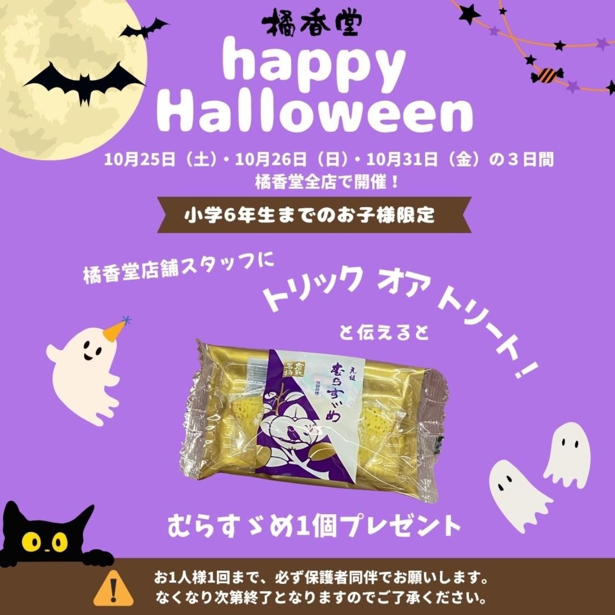 - 10月25日㈯・10月26日㈰・10月31日㈮の3日間、橘香堂全店で小学6年生までのお子様を対象としたハロウィンイベントを行います。期間中、橘香堂店舗スタッフに「トリック オア トリート!」と唱えてもらうとむらすゞめ1個プレゼントいたします。おひとり様1回まで、必ず保護者の方同伴でご来店ください。なくなり次第終了となりますのでご了承ください。皆様のご来店心よりお待ちしております!